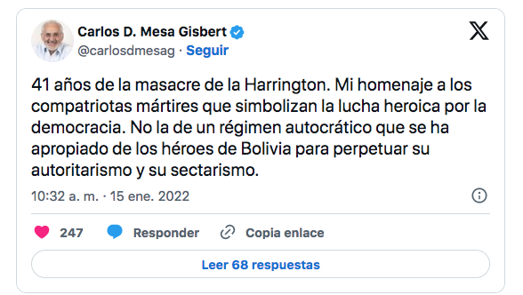 “41 años de la masacre de la Harrington. Mi homenaje a los compatriotas mártires que simbolizan la lucha heroica por la democracia. No la de un régimen autocrático que se ha apropiado de los héroes de Bolivia para perpetuar su autoritarismo y su sectarismo”, escribió Carlos Mesa en sus redes sociales.